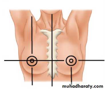 The breast is partitioned into 4 quadrants by vertical and horizontal lines across the nipple:
