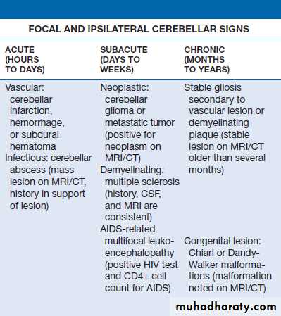 Sensory disturbances can also on occasion simulate the imbalance of cerebellar disease; with sensory ataxia, imbalance dramatically worsens when visual input is removed (Romberg sign). A gradual and progressive increase in symptoms with bilateral and symmetric involvement suggests a biochemical, metabolic immune, or toxic etiology. Conversely, focal, unilateral symptoms with headache and impaired level of consciousness accompanied by ipsilateral cranial nerve palsies and contralateral weakness imply a spaceoccupying cerebellar lesion.the presence of intention tremor , dysmetria , dysnergia, dysdiakokinesia and rebound phenomensa is specific for cerebellar disease.