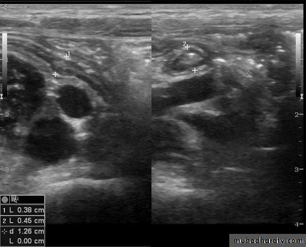 • Accuracy of US is increased by the use of compression and color Doppler imaging and by concentrating the examination to the point of maximal tenderness as indicated by the patient.