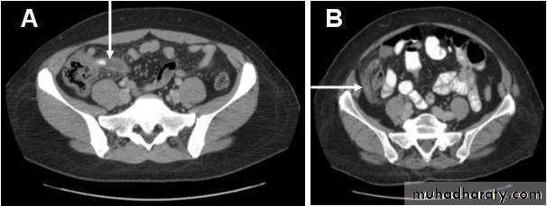 • Localized bowel wall thickening• Soft tissue stranding or haziness in pericolonic fat.