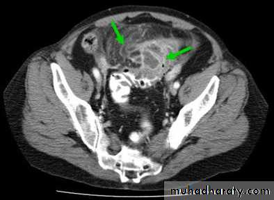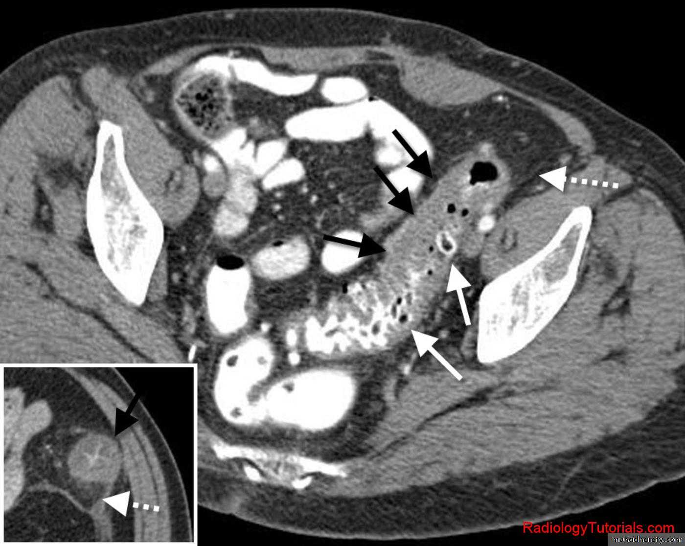 • Gas in the bladder may indicate formation of a colovesical fistula.