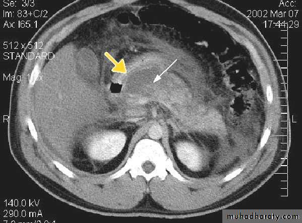 • Complications of pancreatitis, such as phlegmon, abscess and pseudocyst, splenic vein thrombosis, arterial erosion and pseudoaneurysm are well shown on CT.