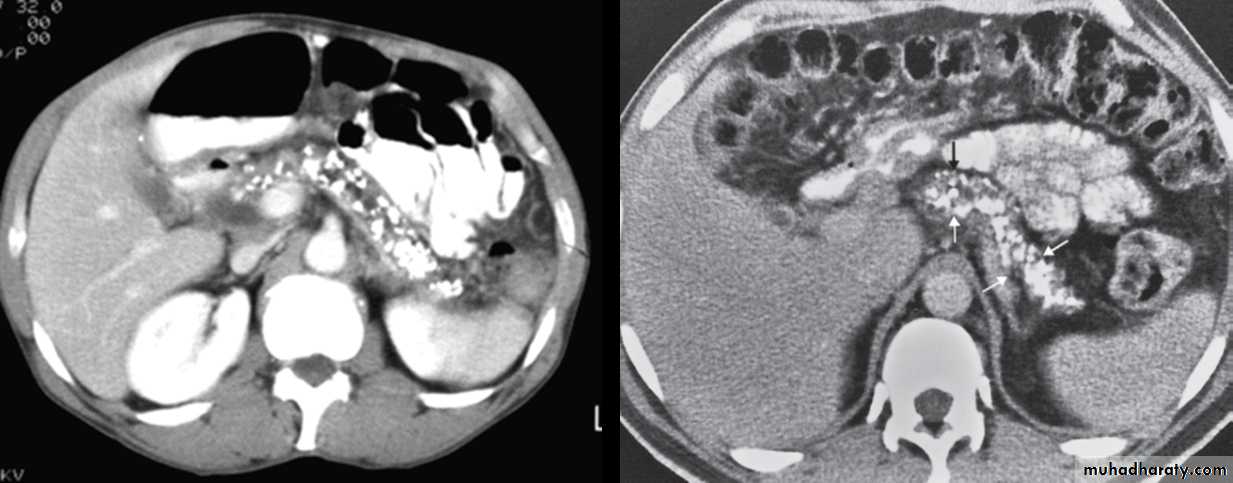 • CT performed during infusion of contrast material can differentiate necrotic non-enhancing tissue from viable enhancing tissue; the presence of pancreatic necrosis is associated with a significantly increased mortality.
