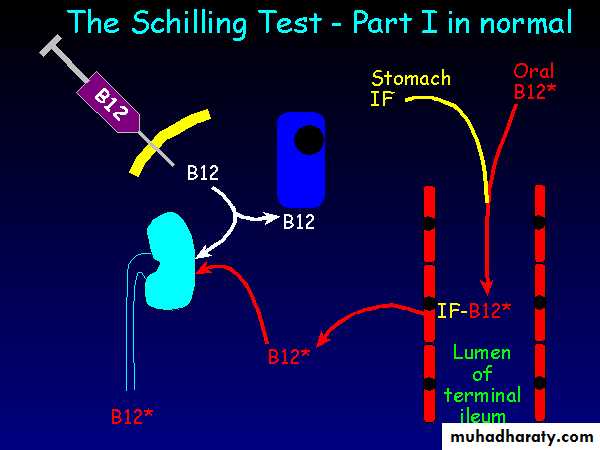 Schilling test; Pre-intrinsic factor 2% B12 isotope excreted. Post-intrinsic factor 2% B12 isotope excreted.
