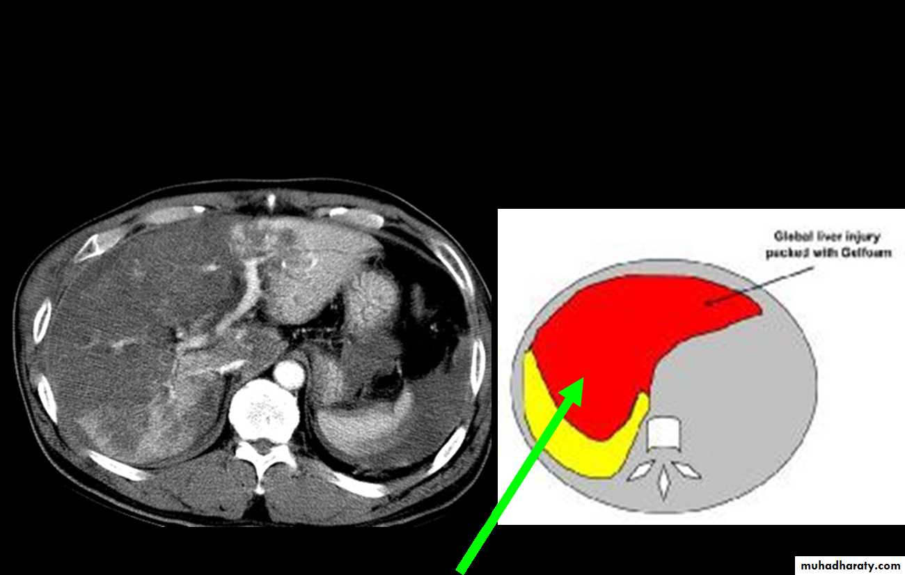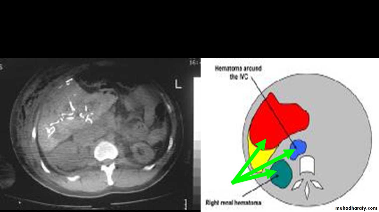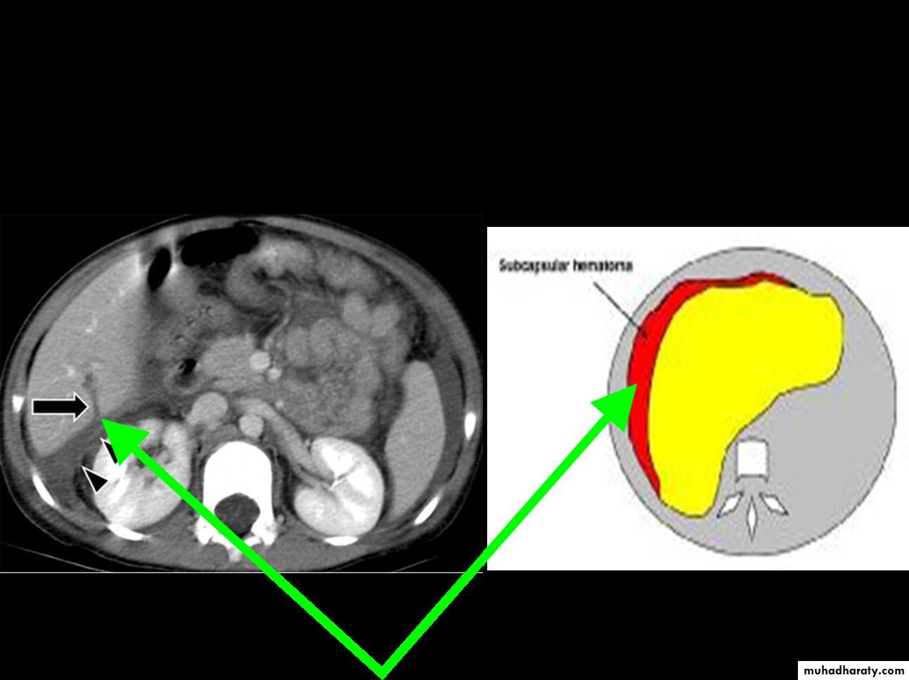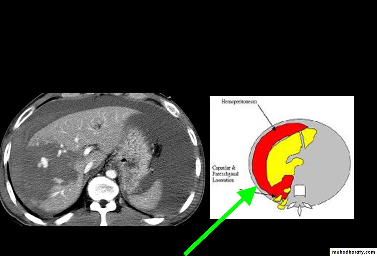 Clinical picture may vary from mild RUQ pain through to peritonism to haemorrhagic shockStable patients undergo CT imaging
