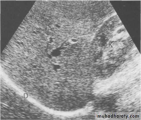 Ultrasound of the liver.Ultrasound of normal liver. Longitudinal scan showing uniform echo pattern interspersed with bright echoes of portal triads and echo-free areas of hepatic and portal veins. D, diaphragm; K, right kidney