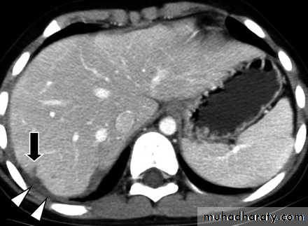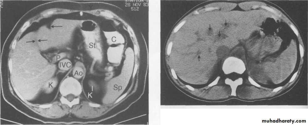 CT scan showing unopacified hepatic veins (arrows) which should not be confused with metastases.