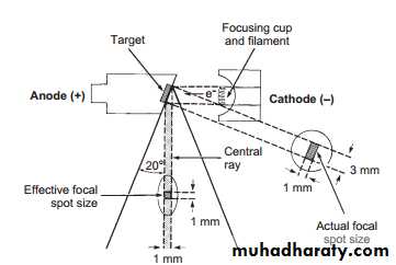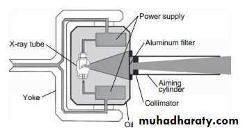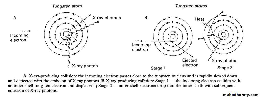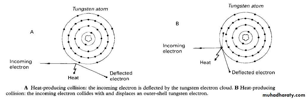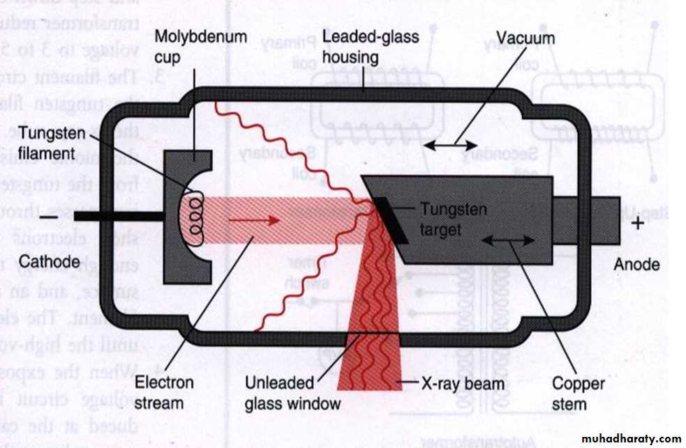 The sequence of events of X-rays production :1. The filament is electrically heated and a cloud of electrons is produced around the filament.2. The high-voltage (potential difference) across the tube accelerates the electrons at very high speed towards the anode. 3. The focusing device aims the electron stream at the focal spot on the target.4. The electrons bombard the target and are brought suddenly to rest.5. The energy lost by the electrons is transferred into either heat (about 99%) or X-rays (about 1%).6. The heat produced is removed and dissipated by the copper block and the surrounding oil.7. The X-rays are emitted in all directions from the target. Those emitted through the small window in the lead casing constitute the beam used for diagnostic purposes.