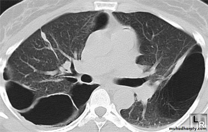 EmphysemaBullae (large air-filled spaces) form in some patients.
