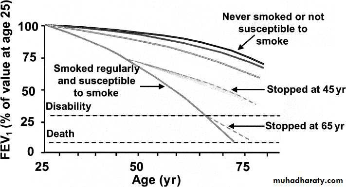 Patients should be strongly and repeatedly advised on the importance of cessation of smoking.Complete cessation is accompanied by improvement in lung function and decrease in the rate of FEV1 decline.