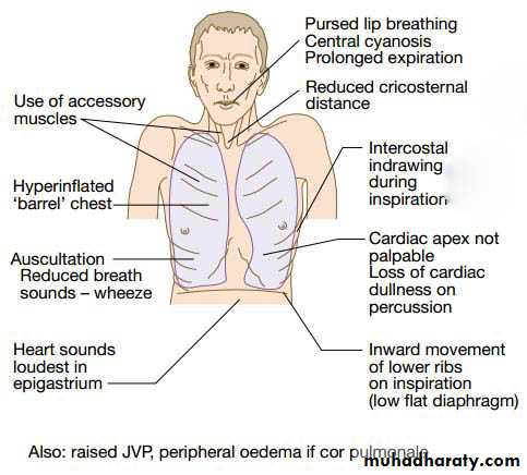 The chest may be hyperinflated "barrel chest", with reduced crico-sternal distance and inward movement of the lower ribs in inspiration (because of low flat diaphragm).The cardiac apex is commonly impalpable, and the heart sounds may be louder in the epigastrium (sometimes with epigastric pulsation).