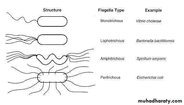 Monotrichous (single polar flagella) e.g. Pseudomonas aeroginosa & viborio choleraAmphitrichous (either single flagella or tuft of flagella at 2 poles e.g. Pseudomonas spp .