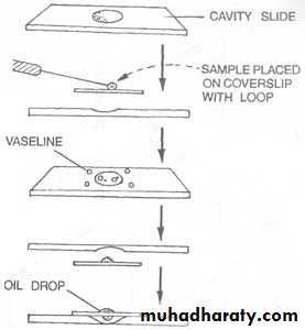 With a wire loop, place a drop of broth containing bacteria on a cover slip, take care to avoid contamination of culture by open the mouth of the tube near the flame .