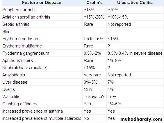Sulfasalazine and its derivative 5-ASA which have efficacy of compared with placebo in ulcerative colitis but not in Crohn's disease.Glucocorticoids are effective in both forms of IBD, although the response of uveitis to topical therapy with glucocorticoids may be less prompt than in uveitis of other causes .