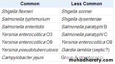 The enteritis is typically mild and may escape recognition, suggesting that a vigorous inflammatory response in the gut may provide protection against arthritis. Fever and acute-phase reactants may be low grade or intense.Self-limited glomerulonephritis, myocarditis, and conjunctivitis are other clinical features.