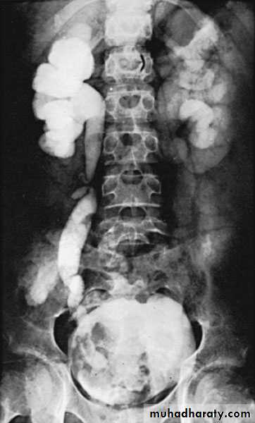 U/S: hydronephrosisIVU: diagnostic , hydronephrosis with fixed stenotic segment or complete obstruction
