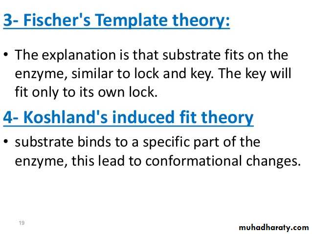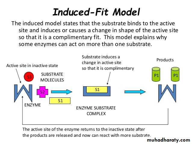 The Induced fit model describes the formation of the E-S as a result of the interaction between the substrate and a flexible active site. The substrate produces changes in the conformation on the enzyme, aligning properly the groups in the enzyme. It allows better binding and catalytic effects.Enzyme Classifications