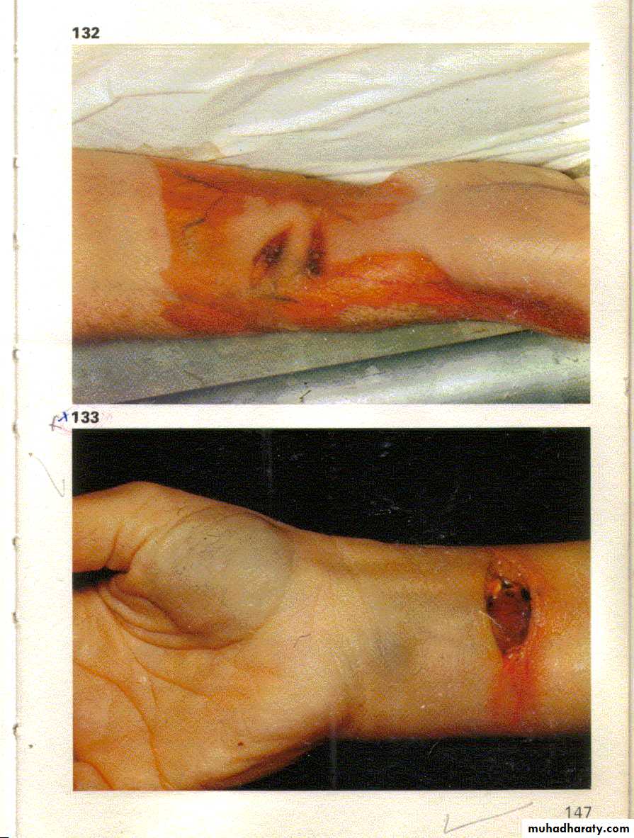 حيث يلاحظ وجود جرح مستعرض الشكل ذو حواف منتظمة ومتباعدة محاط بآثار النزف الدموي توضع عند أعلىالجهة الأمامية لمنطقة الرسغ الأيمن.