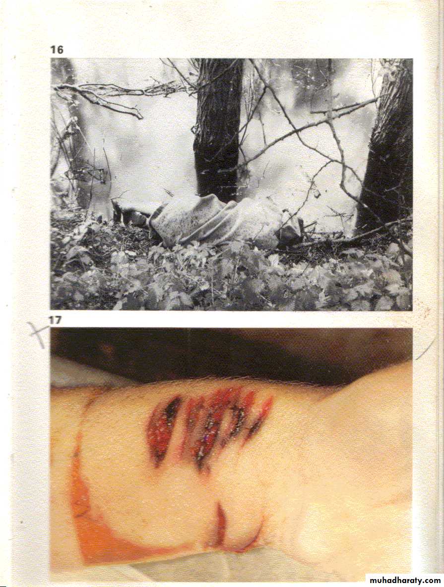 هي جروح قطعية سطحية غير مميتة في متناول اليد والبصر يُحدثها الشخص المنتحر في جسمه قبيل أحداثه الجرح الكبير والمميت بوقت قصير وتكون مجاورة له .ج- الجروح القطعية الكفاحية (الدفاعية). (Defensive wounds )