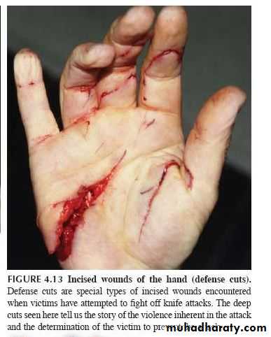 الجروح القطعية الكفاحية (الدفاعية). (Defensive wounds ) جروح متعددة في باطن الكف عندما يحاول الشخص مسك الالة الحادة بيده وتعطي فكرة عن نوع الالة الحادة وجود هذه الجروح في باطن الاصابع وراحة الكف تدل على ان الالة المستخدمة في الحادث ذات حافتين حادتين