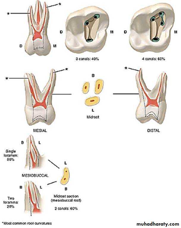 Mesial root has 2 canals in 85% ofwhile distal root contains more than 2 canals