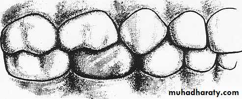 • The prominent mesiobuccal cervical ridge of mandibular and maxillary first molars must be accommodated in the preparation of stainless steel crowns, which may otherwise result in a ‘rocking’ crown.