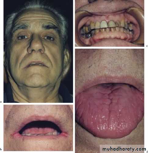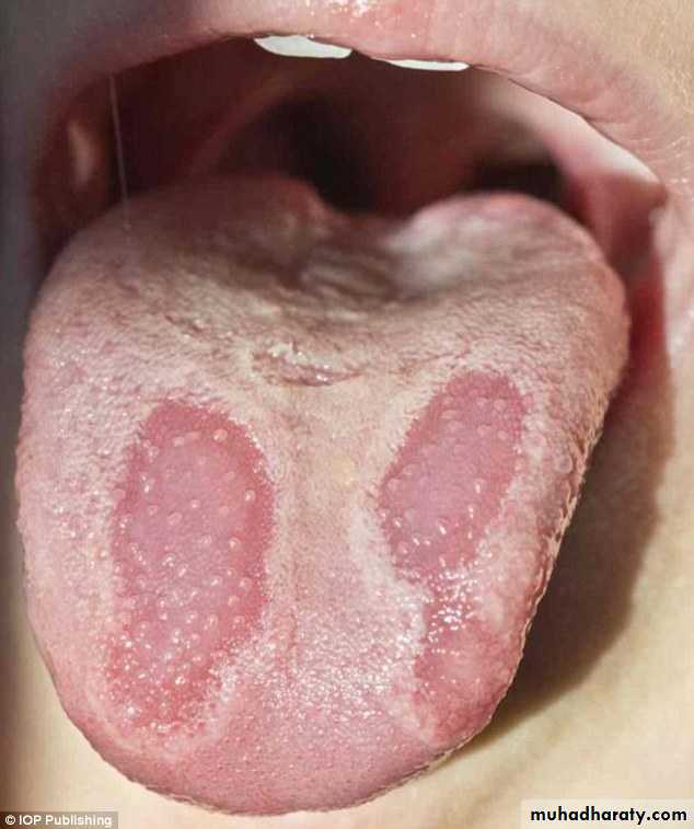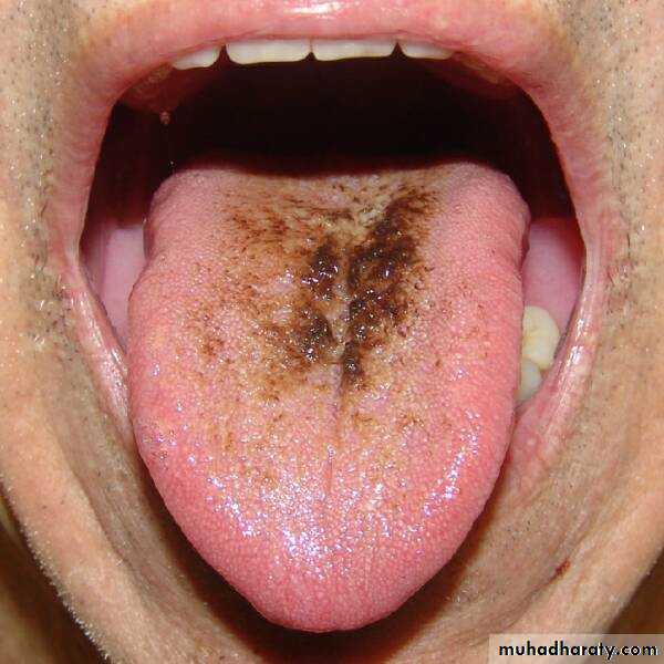 Tongue mucosa: geographic tongue, Red inflamed tongue ,hairy tongue , candida albicans.