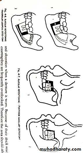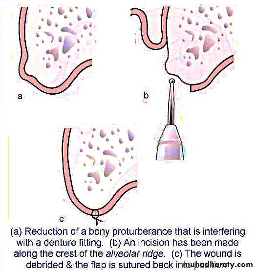 _Cortical compression………if denture construction urgent…..exo…crestal incision….. bone removed ….smoothed…suture if many exo._Intercortical alveoloplasty …… anterior ridge prominent…undercuts….interradicular septa removed …..rongeur …crushed…suture