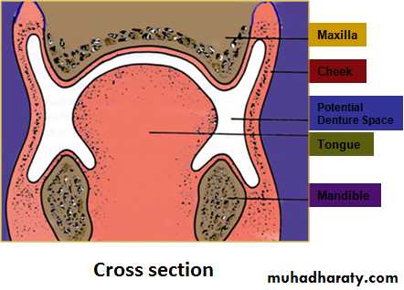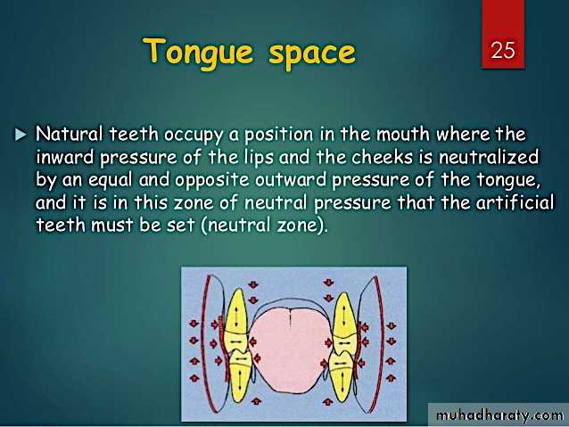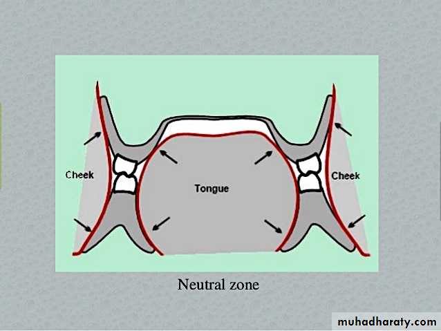 Is a potential space between lips and cheeks on one side and the tongue on the other side.The area or position where the forces between lip , cheeks and tongue are equal teeth should be located in this space…..outside this zone will cause dislodge of denture