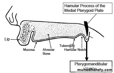 Connects from the hamulus to the mylohyoid ridge,When prominent, can cause pain, or loosening,