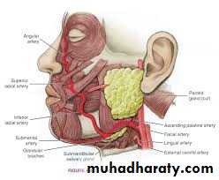 The face receives a rich blood supply from two main vessels: the facial and superficial temporal arteries that accompany the sensory nerves of the face The facial artery arises the external carotid artery. Having arched upward and over the submandibular salivary gland, it curves around the inferior margin of the body of the mandible at the anterior border of the masseter muscle . it is here that the pulse can be easily felt . it runs upward in a tortuous course toward the angle of the mouth and is covered by the platysma and the risorius muscles. It then ascends deep to the zygomaticus muscles and the levator labii superioris muscle and runs along the side of the nose to the medial angle of the eye, where it anastomoses with the terminal branches of the ophthalmic artery .