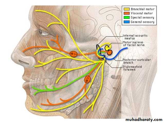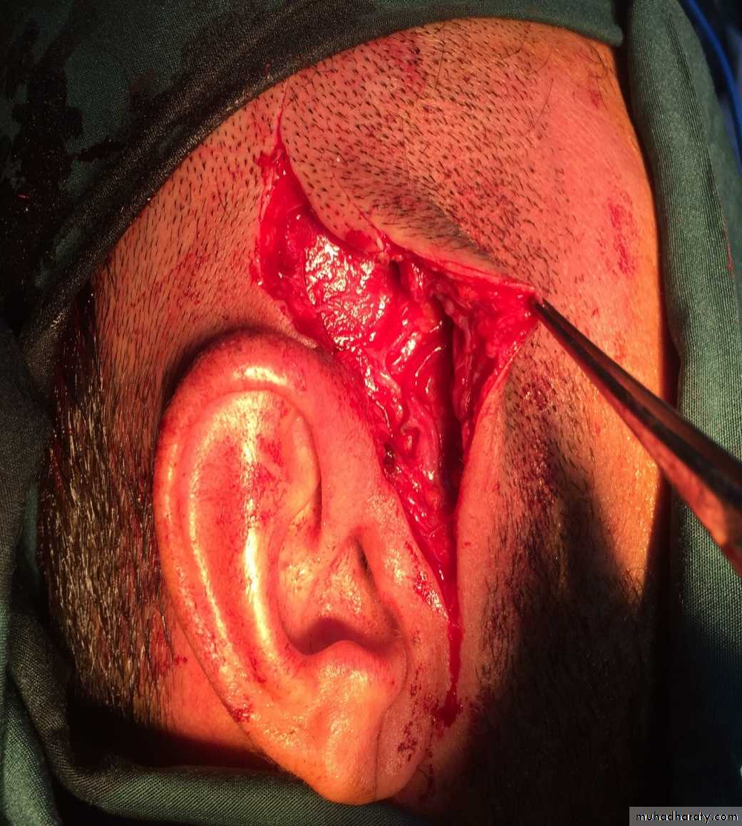 • The zygomatic branch emerges from the anterior border of the gland and supplies the orbicularis oculi.