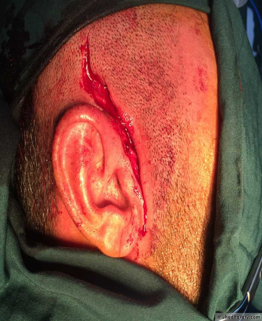 The superficial temporal artery , the smaller terminal branch of the external carotid artery , commences in the parotid gland. It ascends in front of the auricle to supply the scalp . the transverse facial artery , a branch of the superficial temporal artery, arises within the parotid gland. It runs forward across the cheek just above the parotid duct .