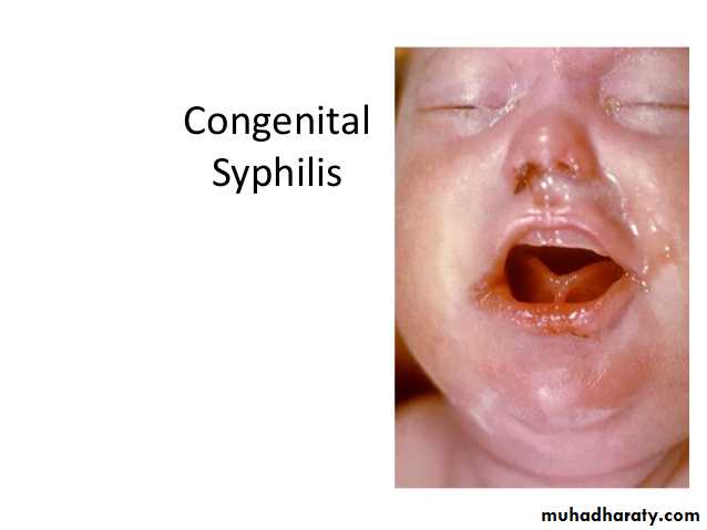 • A snuffle is the name given to the commonest nasal manifestation. this is a rhinitis which rapidly becomes purulent• Fissuring and crusting of the vestibule and lips are caused by the irritating discharge so that sucking may be prevented . occasionally necrosis of bone and cartilage occurs