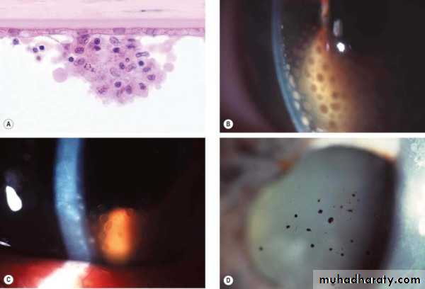 3- Keratic precipitates: cellular deposits on the corneal endothelium (deposition of inflammatory cells into corneal endothelium).