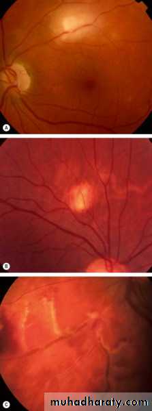 2- Retinitis: ill-defined, focal, white, cloudy appearance of retina with obscuration of retinal vessels.