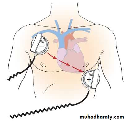 External defibrillation and cardioversion:The heart can be completely depolarised by passing a sufficiently large electrical current through it from an external source. This will interrupt any arrhythmia and produce a brief period of asystole that is usually followed by the resumption of sinus rhythm. Defibrillators deliver a DC, high-energy, short-duration shock via two large electrodes or paddles coated with conducting jelly or a gel pad, positioned over the upper right sternal edge and the apex. Modern units deliver a biphasic shock, during which the shock polarity is reversed mid-shock This reduces the total shock energy required to depolarize the heart.