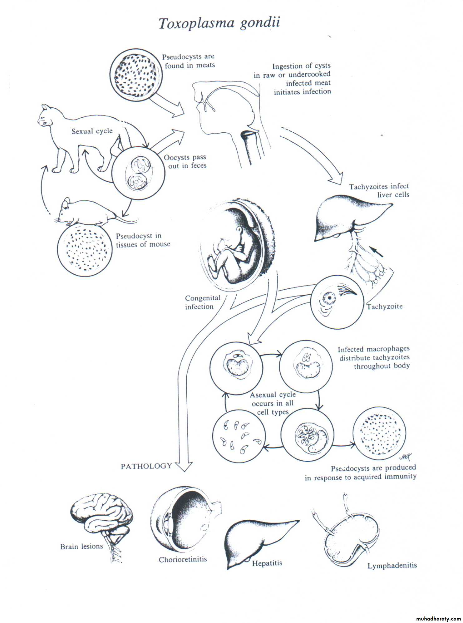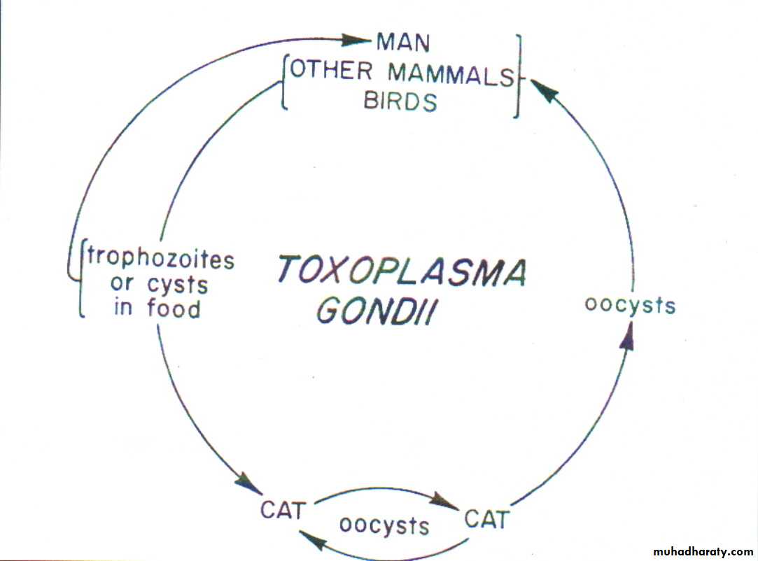 • Definitive hosts are cats (in intestinal tract) which acquire infection from eating infected mammals (rodents and birds).