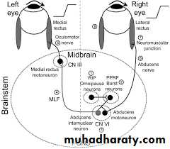 • Diplopia may result from internuclear ophthalmoplegia (INO) or from palsy of the sixth cranial nerve (rarely the third or fourth).