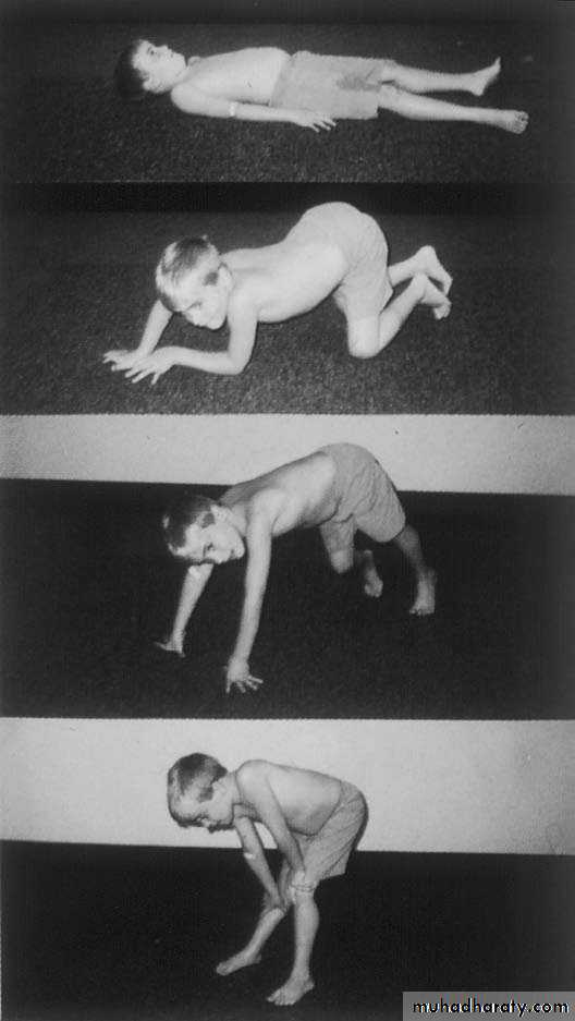 This X-linked recessive disorder, sometimes also called pseudohypertrophic muscular dystrophy, has an incidence of ~30 per 100,000 live-born males , Duchenne dystrophy is present at birth, but the disorder usually becomes apparent between 3 and 5 years of age.The boys fall frequently and have difficulty keeping up with friends when playing. Running, jumping, and hopping are invariably abnormal. By 5 years, muscle weakness is obvious by muscle testing. On getting up from the floor, the patient uses his hands to climb up himself [Gowers’maneuver , the child has pseudohypertrophy of calf muscle..Contractures of the heel cords and iliotibial bands become apparent by 6 years, when toe walking is associated with a lordotic posture.