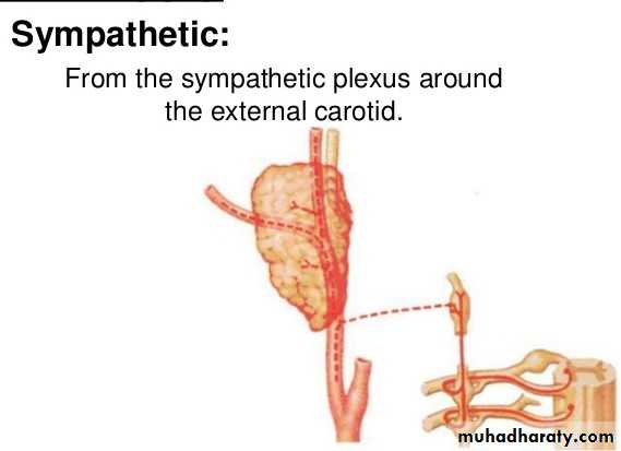 Stimulation of the parasympathetic fibers produces a thin , watery saliva , sympathetic fibers are derived from cervical ganglia through the external carotid nerve plexus on the external carotid artery . the vasomotor activity of these fibers May reduce secretion from the gland sensory nerve fibers pass to the gland through the great auricular and auriculotrmporal nerve.