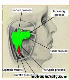 4. Pterygoid process that extends forward from the deeper part lies between the medial pterygoid muscle & the ramus of mandible .5. Carotid process that lies posterior to the external carotid artery .