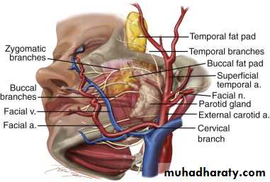the parotid region includes the parotid gland and duct , the facial nerve, the retromandibular vein, the external carotid artery , and the masseter muscle.