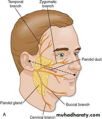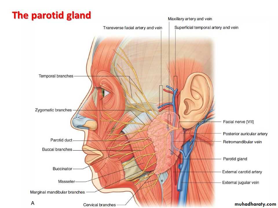 The parotid gland is the largest of three paired salivary glands. It composed mostly of serous acini. Although the facial nerve ( cn VII) is embedded within the parotid gland , the branches extending from the gland to innervate the muscles of facial expression are divides the gland into superficial and deep lobes.The parotid gland is enclosed within a tough, unyielding, fascial capsule the parotid sheath (capsule), derived from the investing layer of deep cervical fascia. The parotid gland has an irregular shape because the area occupied by the gland, the parotid bed is anteroinferior to the external acoustic meatus, where it is wedged between the ramus of the mandible and the mastoid process. The apex of the parotid gland is posterior to the angle of the mandible, and its base is related to the zygomatic arch.