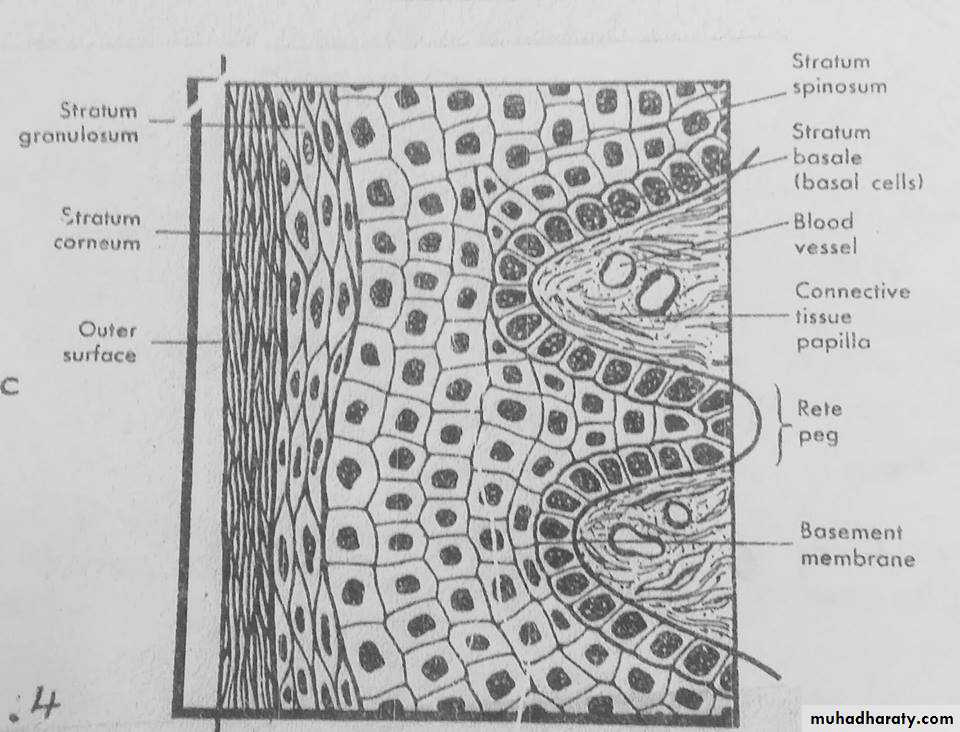 The basal cells are found immediately adjacent to the connective tissue and seperated from this tissue by a basment membrane (basal lamina).