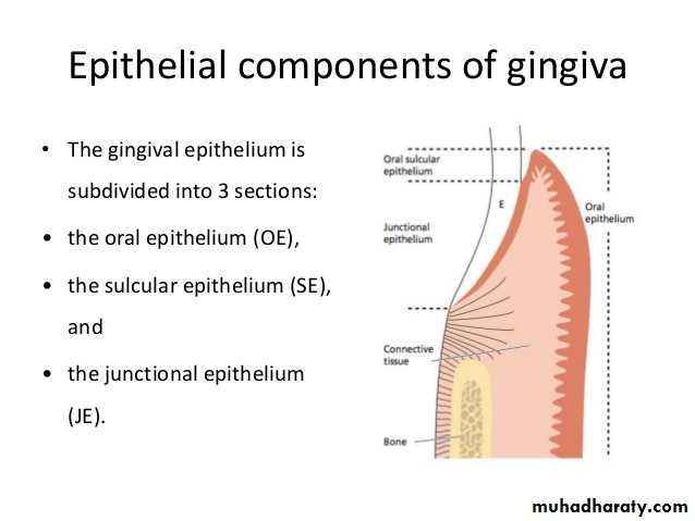 The oral epithelium faces the oral cavity, sulcular epithelium faces the tooth without touching it, junctional epithelium which provides the contact between the gingiva and the tooth surface.