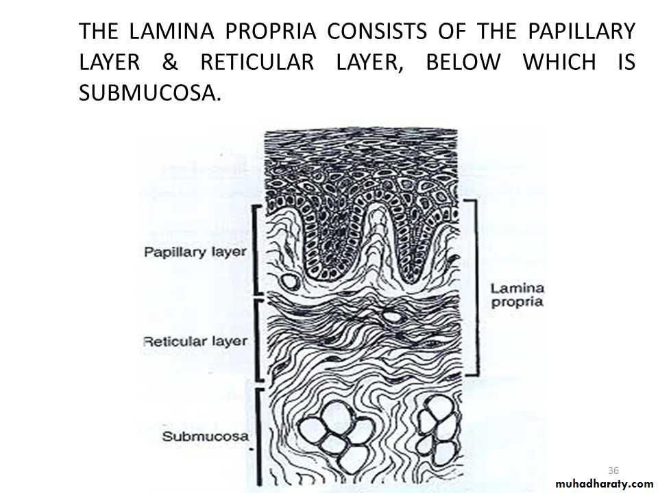 The connective tissue of the gingiva is known as lamina propria and consists of 2 layers:The papillary layer : it consists of papillary rojection between the eithelial rete pegs.