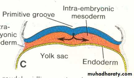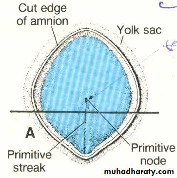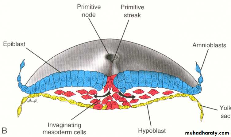 The most characteristic event occurring during the third week is gastrulation which is the process of establishment of the three germ layers (ectoderm, mesoderm , and endoderm ) [these three layers known as trilaminar germ disc] gastrulation begins with the formation of the primitive streak on the surface of the epiblast as a narrow groove with elevated areas on either sides. The cephalic end of the streak which is called the primitive node consists of a small pit surrounded by elevated area.Note : after the formation of primitive Node it becomes possible to identify the craniocaudal axis of the embryo , it's dorsal and ventral surfaces and it's right and left sides.