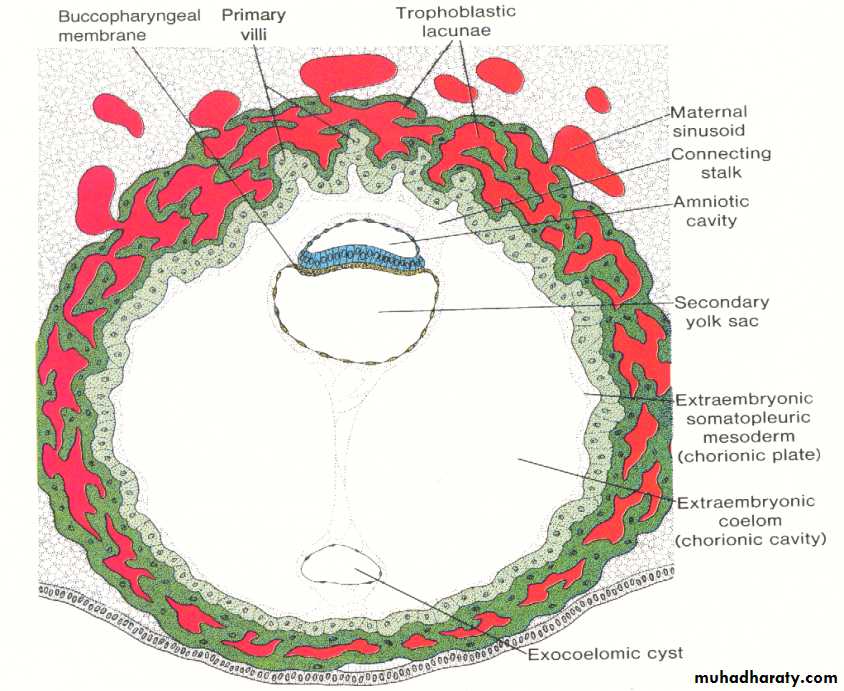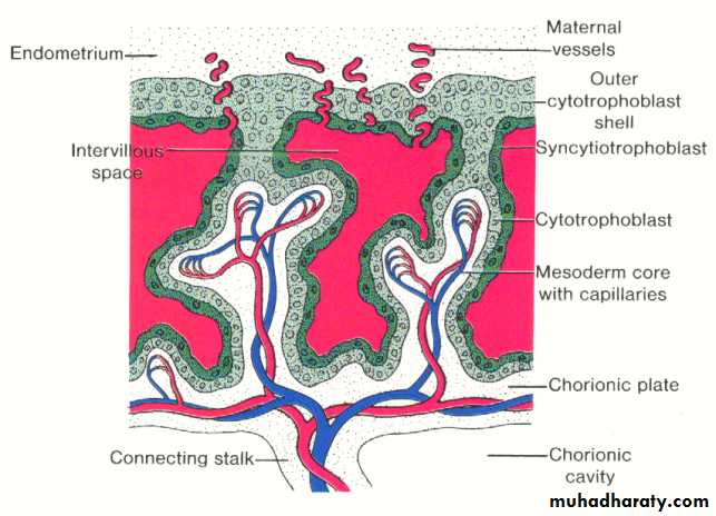 By the end of the second week , the primary stem villi have already been formed , consisting of a core of cytotrophoblast surrounded by syncytium. during the third week , the extra embryonic mesoderm invades or penetrates the cytotrophoblast of the primary villi forming the secondary villi , which consists of a core of mesoderm surrounded by alayer of cytotrophoblast which in turn surrounded by syncytium. by the end of the third week some of the mesodermal cells in the villus core differentiate into blood cells and vessels forming the villous capillary system and the villous now is known as the tertiary stem villus.The capillaries in the tertiary villi make contact with those developing in the chorionic plate and in the connecting stalk. these extra embryonic circulatory system vessels in turn establish contact with intra embryonic circulatory system , thus connecting the placenta and the embryo.