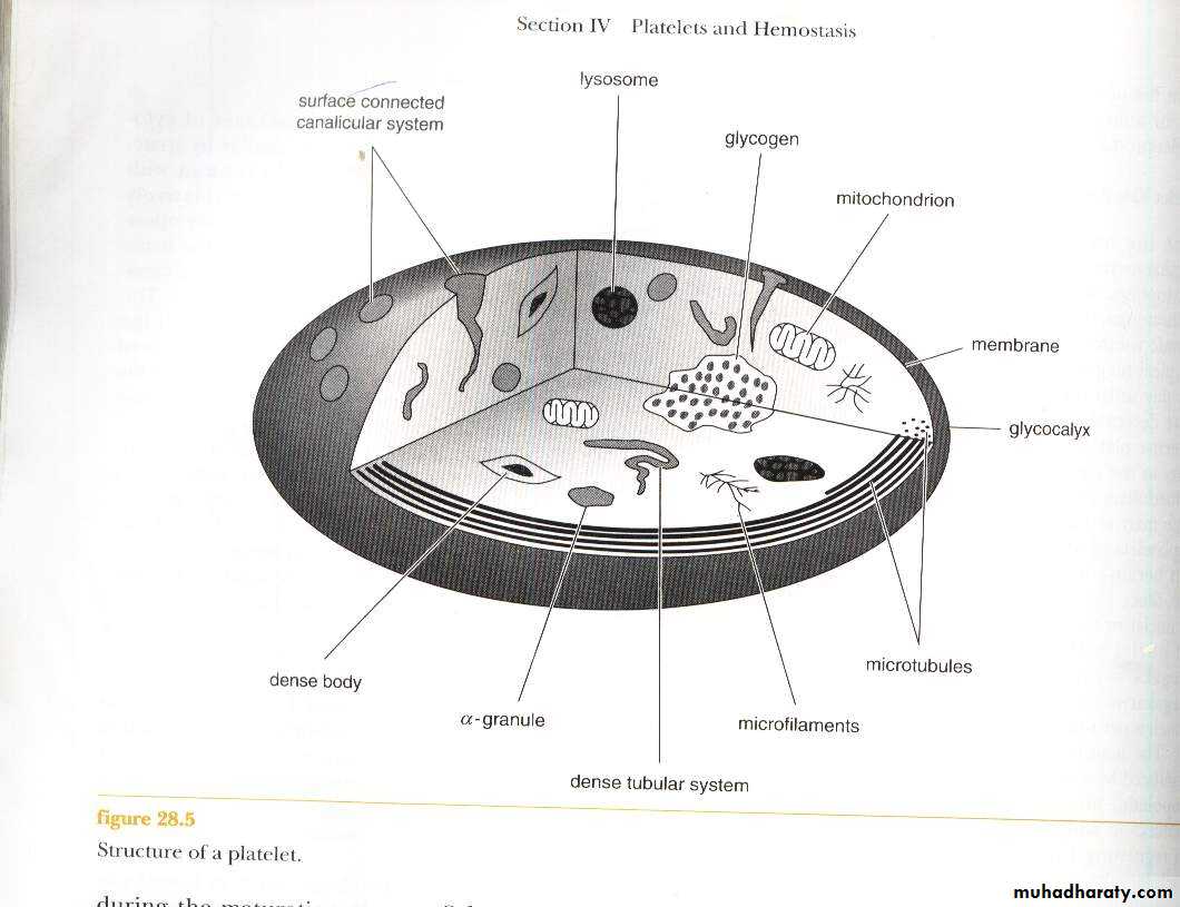 Platelets do not have nuclei .Platelets are discoid-shaped packages of cytoplasm surround by a membrane. Platelets surface has many openings that extended deeply into the interior of the structure which give the platelets a sponglike appearance. Clotting factors such as factor I (fibrinogen), factor V (labile factor) & factor VIII (antihemophilic factor A) are adhere to these openings.. Also the membrane contain large amount of phospholipids [(platelet factor 3(PF3)] which plays an important role in clotting process.The platelet cytoplasm contains large quantities of ADP, ATP, serotonin, Ca++ & thromboxanes A2, factor XIII &, actin & myosin (that can cause contraction of the platelet these contractile proteins are important in clot retraction).